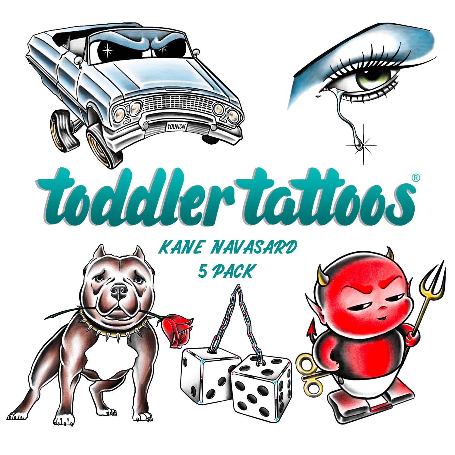 Working out of his shop, For the Sinners, in Whittier, California, Kane’s artistry goes beyond tattoos. His drive to evolve has led him into the realms of fashion, jewelry, and digital art, making his brand a diverse and innovative force in the creative world.Recently, he collaborated with us to bring his unique style and vision to Toddler Tattoos, offering a fresh take on temporary tattoos for the next generation.