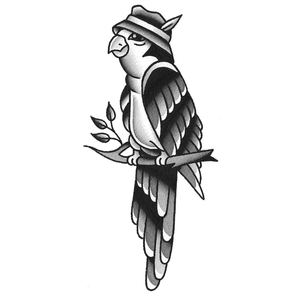 Our temporary tattoo design, the "Fedora Parrot", is a one to one scale transfer of the original hand painted artwork by Tim Hendricks and Javier DeLuna.