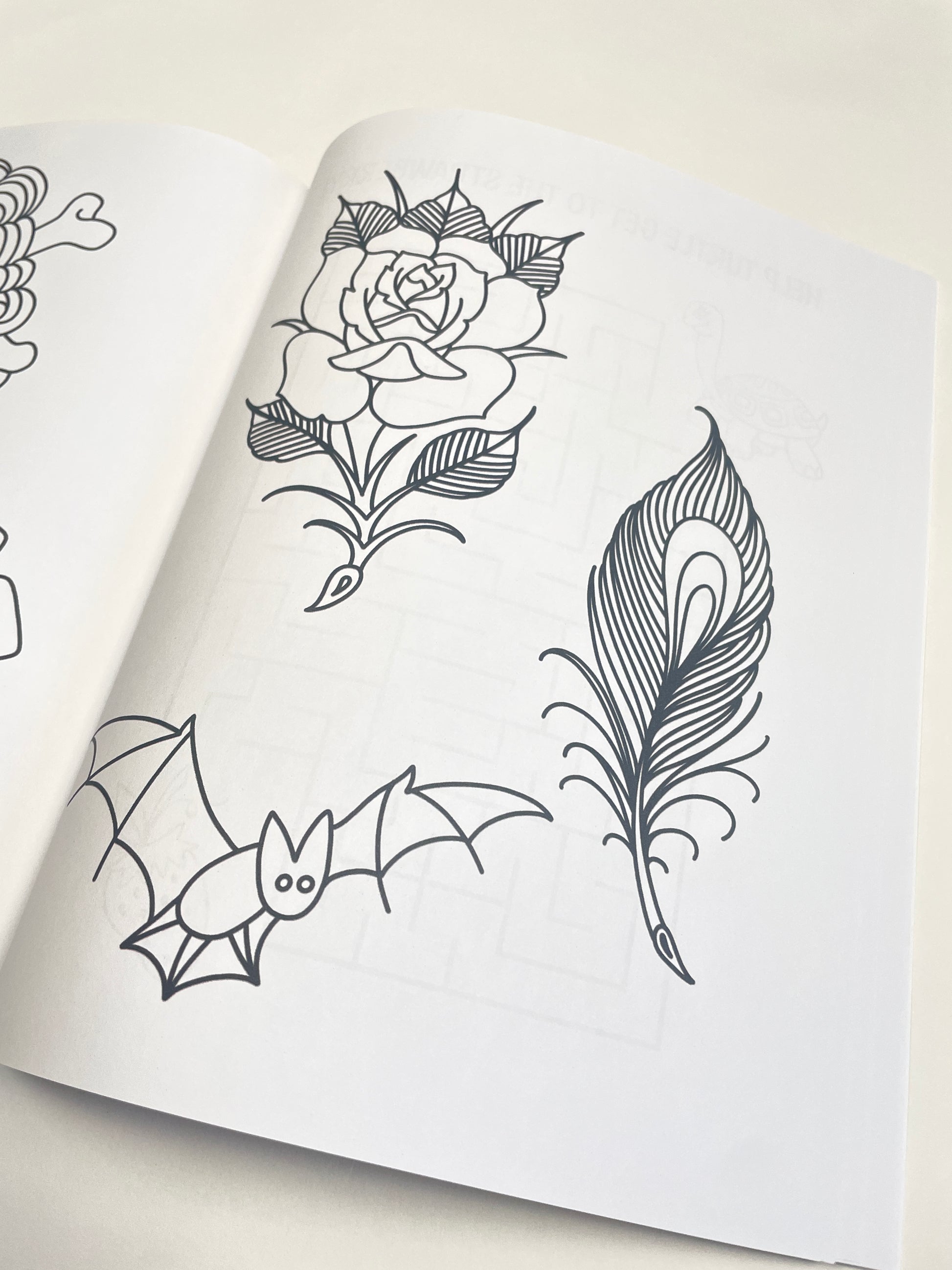 Filled with many images from tattoo artist Tim Hendricks, Javier DeLuna, and Jose Araujo. Along with more, there are entertaining mazes and crossword puzzles. This book is a must have for any young artist or tattoo enthusiast's library!