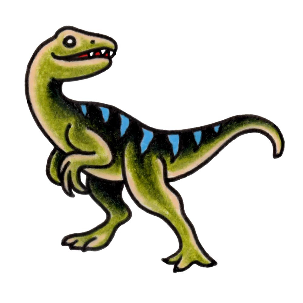 Our temporary tattoo design, the "Velociraptor", is a one to one scale transfer of the origina artwork by Tim Hendricks and Javier DeLuna.